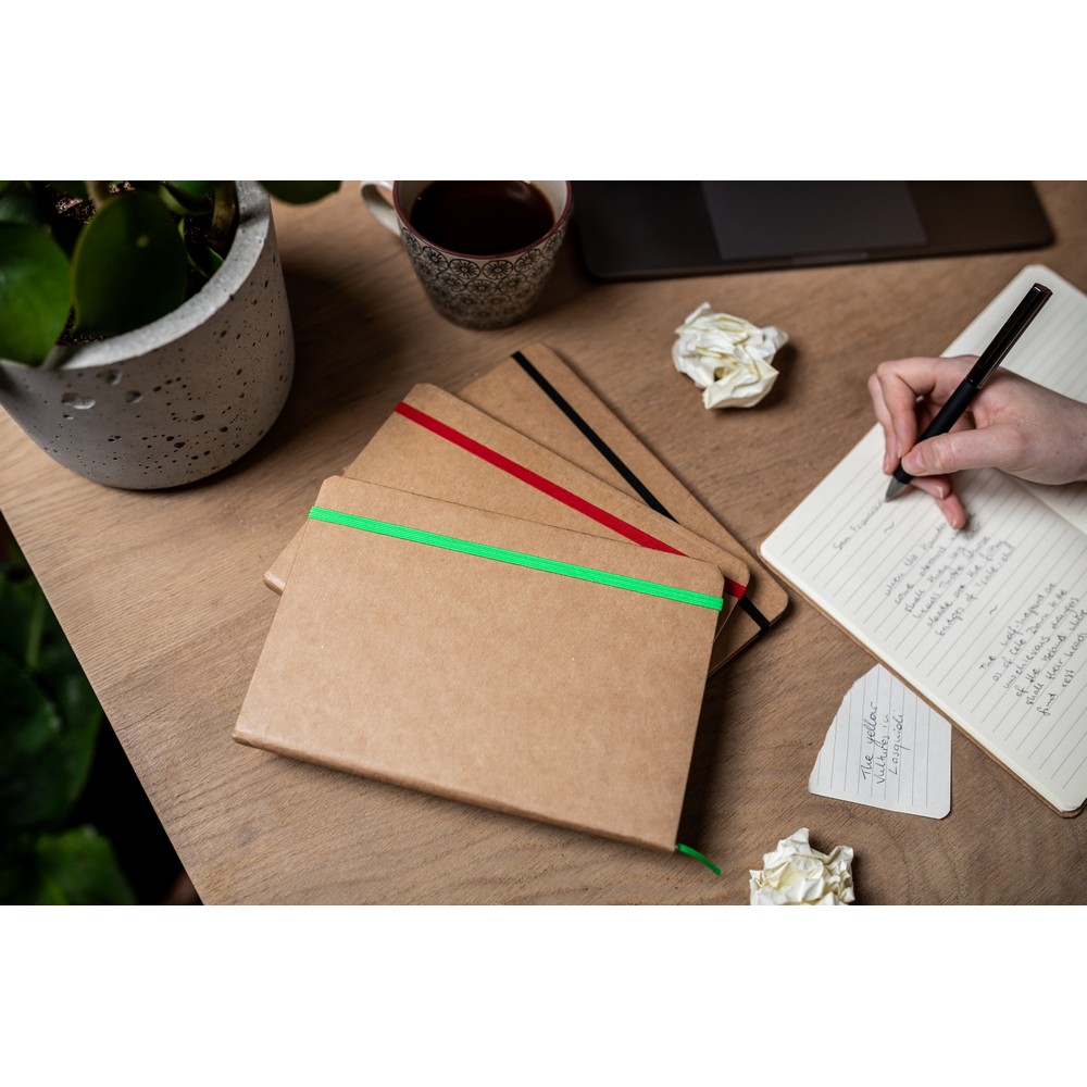 Der feste Einband aus Recyclingkarton verbindet Nachhaltigkeit mit Stil, während das praktische Lesezeichen und der elastische Verschluss für eine mühelose Handhabung sorgen. Ihr Logo wird durch verschiedene Drucktechniken perfekt zur Geltung gebracht und bleibt langfristig im Gedächtnis – ideal für nachhaltige Werbung, die nicht im Müll landet.